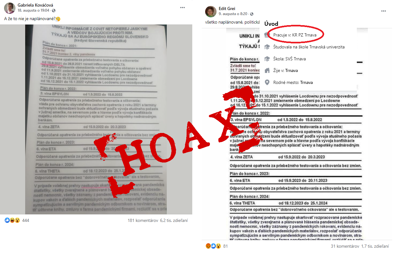 Spolupráca Policajného zboru a spoločnosti Facebook priniesla ďalší konkrétny úspech. Konto pod názvom "Gabriela Kováčová" šírilo status, v ktorom bol obrázok papiera s plánom šírenia koronavírusu, respektíve s dátumami začiatku ďalších vĺn.V dokumente sa nachádzalo toľko primitívnych gramatických a štylistických chýb (Covit), že by sa...
