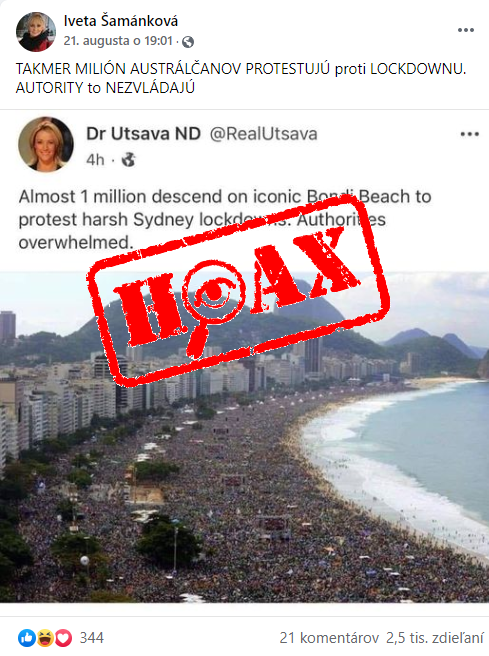 Užívateľský profil na Facebooku "Iveta Šamánková" uverejnil pred dvoma dňami status v znení: "TAKMER MILIÓN AUSTRÁLČANOV PROTESTUJÚ proti LOCKDOWNU. AUTORITY to NEZVLÁDAJÚ". Súčasťou statusu je aj fotografia veľkého zhromaždenia ľudí na pláži.Predmetný hoax zdieľalo viac ako 2 500 užívateľov Facebooku. A opäť raz naletelo.Zdroj hoaxu:...