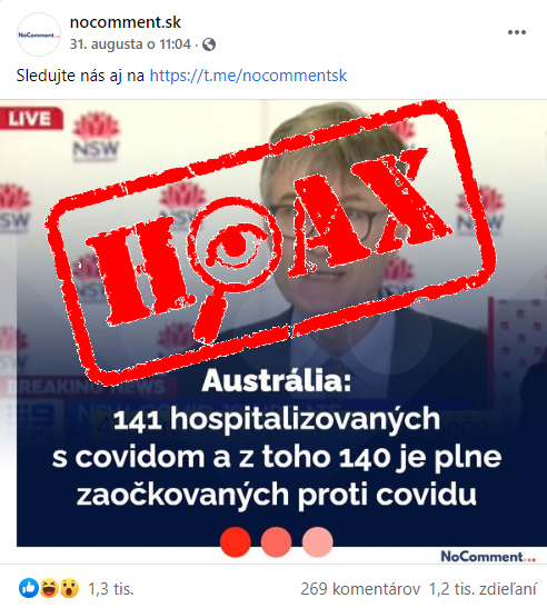 Facebooková stránka nocomment.sk zverejnila status s tvrdením, že v Austrálii bolo hospitalizovaných 141 pacientov s ochorením Covid-19 a z toho 140 ich bolo plne zaočkovaných proti covidu-19. Táto stránka šíri klamstvo.Zdroj hoaxu: https://www.facebook.com/nocommentsk.sk/posts/1737807743083747INŠPIRÁCIA V ZAHRANIČÍ?Status slovenskej facebookovej stránky očividne vychádza z tlačovej besedy doktora Jeremyho...