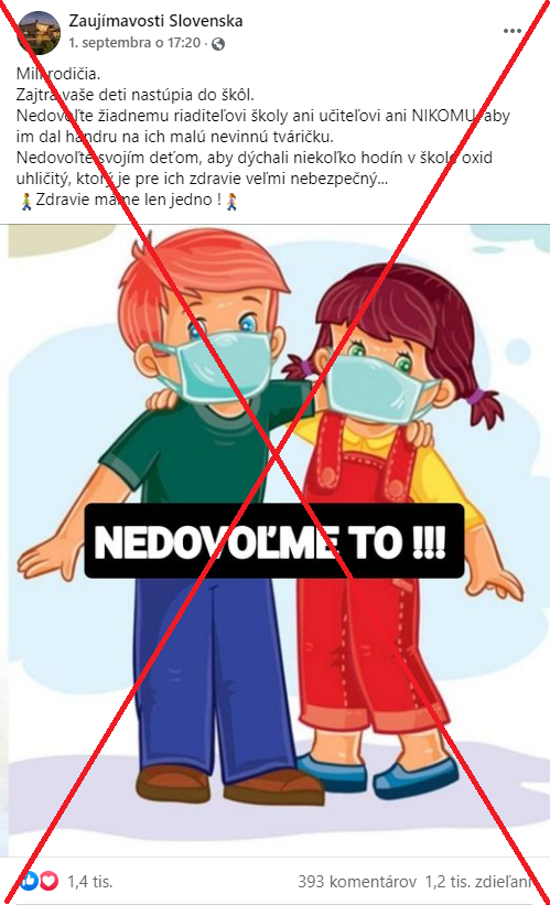 Facebooková stránka "Zaujímavosti Slovenska" sa opäť činí. Pred dvoma dňami zverejnila srdcervúci status s obrázkom detí s rúškami a odkazom, aby deti nemali "handru na ich malej nevinnej tváričke".Aby jej status dostal osobitejšiu esenciu, facebooková stránka použila hoax starší ako dinosaury, v znení "Nedovoľte svojim...