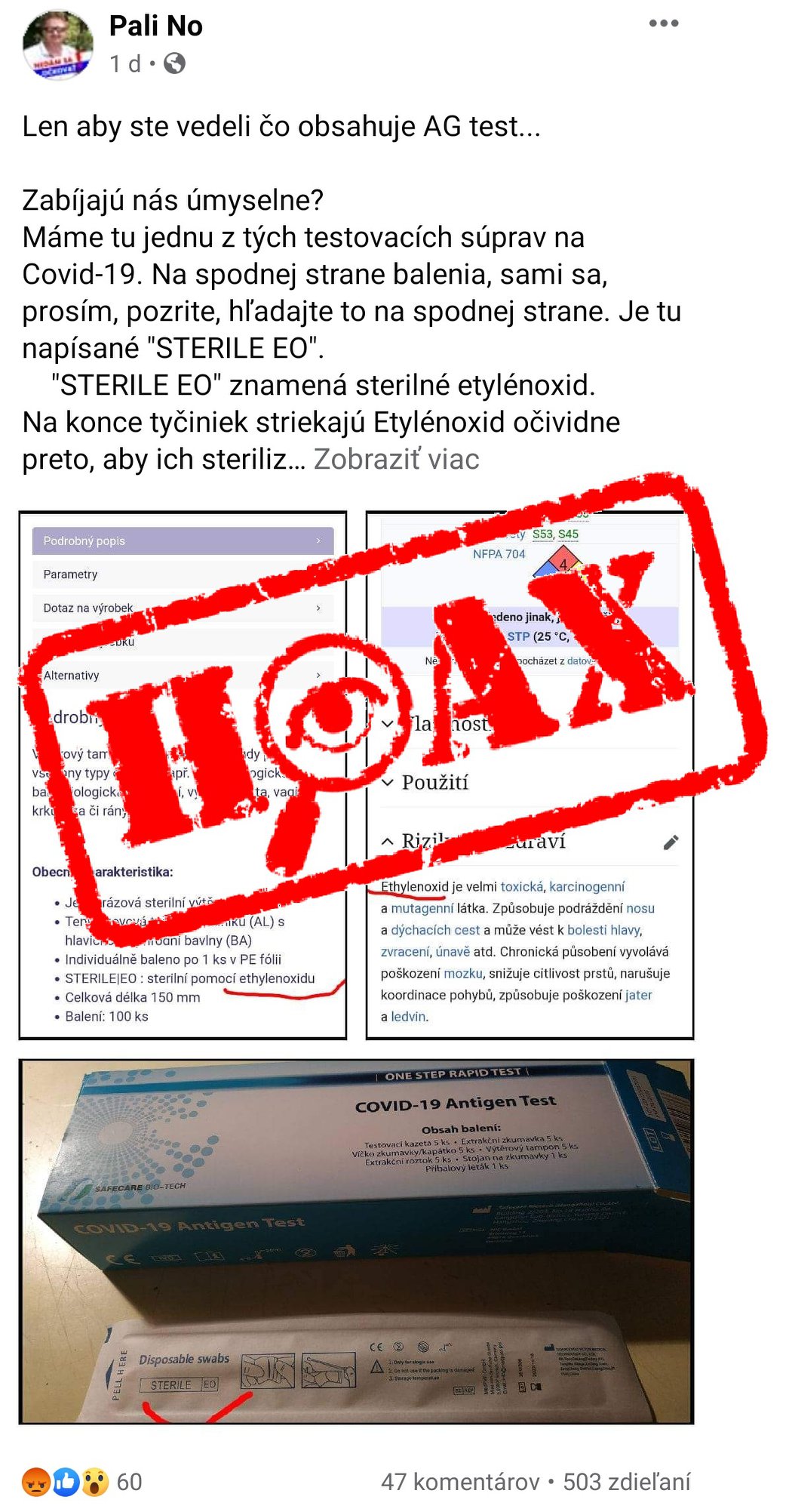 Aj niektorí slovenskí konšpirátori si osvojili hoax, ktorý hovorí o tom, že antigénové testy obsahujú nebezpečný etylénoxid.Konkrétne užívateľský profil "Pali No" na svojom profile píše, že na spodnej strane balenia testu je napísané "STERILE EO", čo znamená sterilný etylénoxid. Ide o jednu z najhorších chemikálií,...