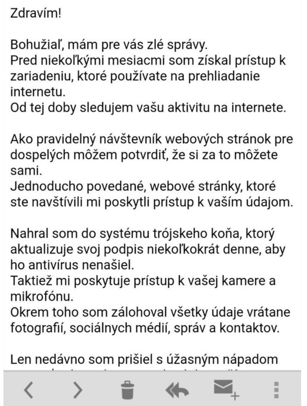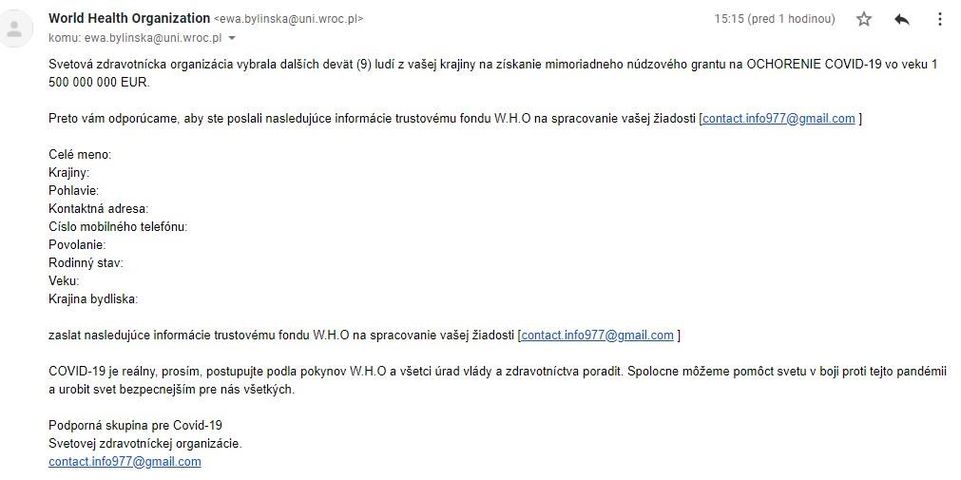 Upozornila nás pani Andrea: "Môj manžel dnes dostal list zo Španielska od určitého právnika. List je napísaný po anglicky, v ktorom je vymyslený príbeh o zosnulej príbuznej, ktorá zanechala majetok v hodnote 2,7 milióna eur. Právnik dobrosrdečne navrhuje rozdelenie majetku, aby sa 20% venovalo charite...