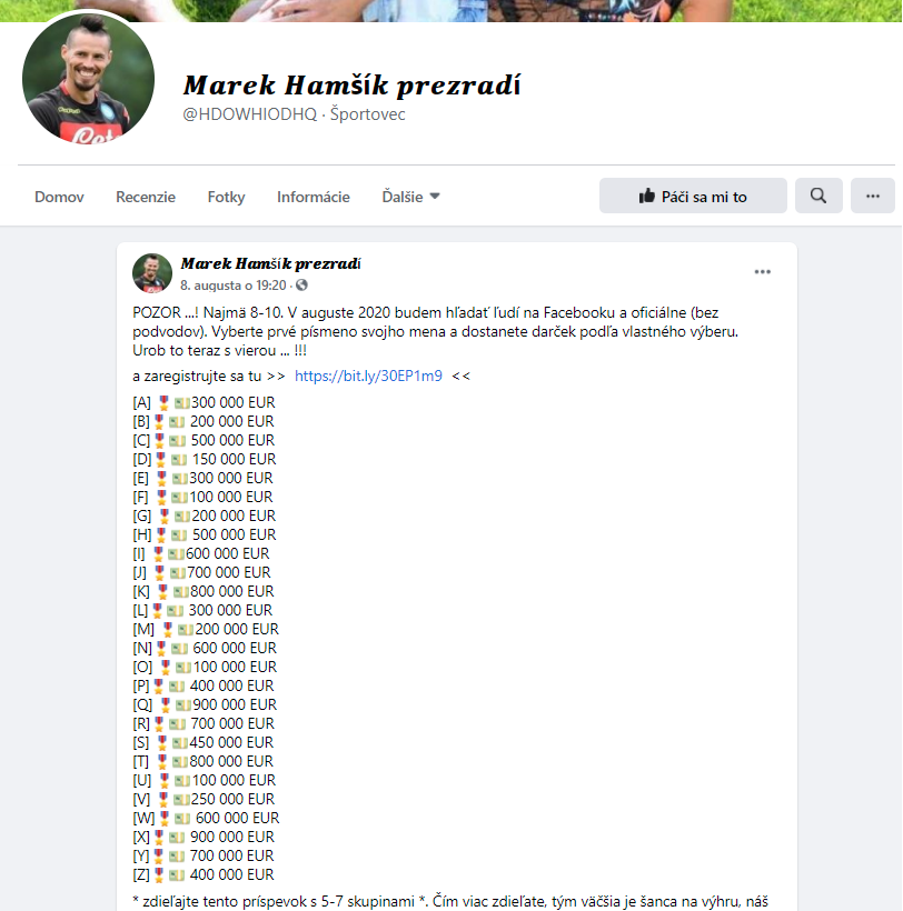 Zaregistrovali sme statusy stránok, ktoré zneužívajú známe osobnosti. Cieľom ich falošných statusov je donútiť vás s prísľubom výhry alebo peňažného zisku kliknúť na odkaz. Následne ďalšími krokmi môžete prísť o svoje peniaze, prípadne heslá. Pamätajte si, že najznámejšie osobnosti majú pri názve svojho Facebooku modrý...