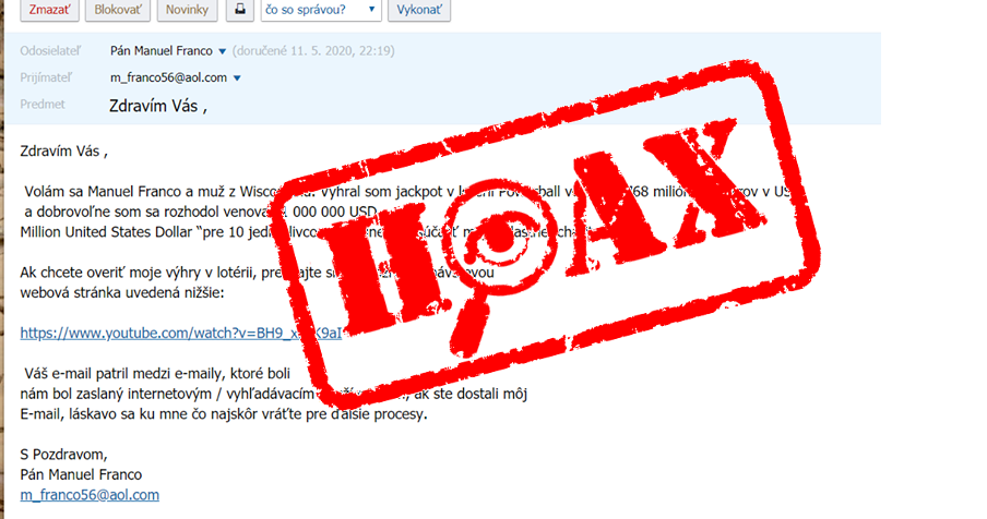 Manuel Franco - minuloročný víťaz americkej lotérie, v ktorej vyhral 768 miliónov dolárov. Iba táto informácia je z celého emailu pravdivá.Podľa emailovej správy Vám víťaz lotérie pošle 1 000 000,- dolárov ako jednému z desiatich šťastlivcov na svete. Aby vyzeral email dôveryhodne, je v texte...