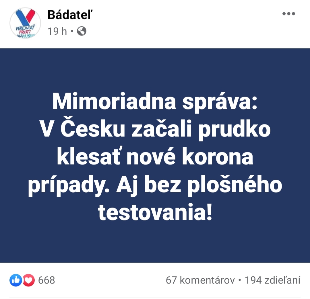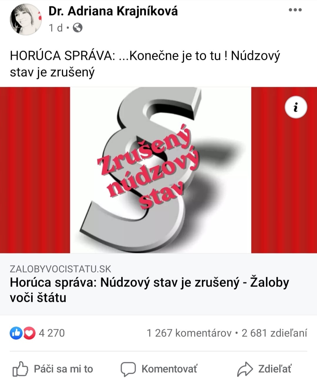 Facebooková popularita je veľmi nákazlivá vec.Autorka statusu razí svoju pomýlenú teóriu o neplatnosti uznesenia vlády o vyhlásení núdzového stavu a chcela na to upozorniť humorným spôsobom, ktorý jej ale absolútne nevyšiel. Vo svojom mene napísala "akože" uznesenie, ktorým akože "zrušila núdzový stav". Dezinformácia je extrémne...