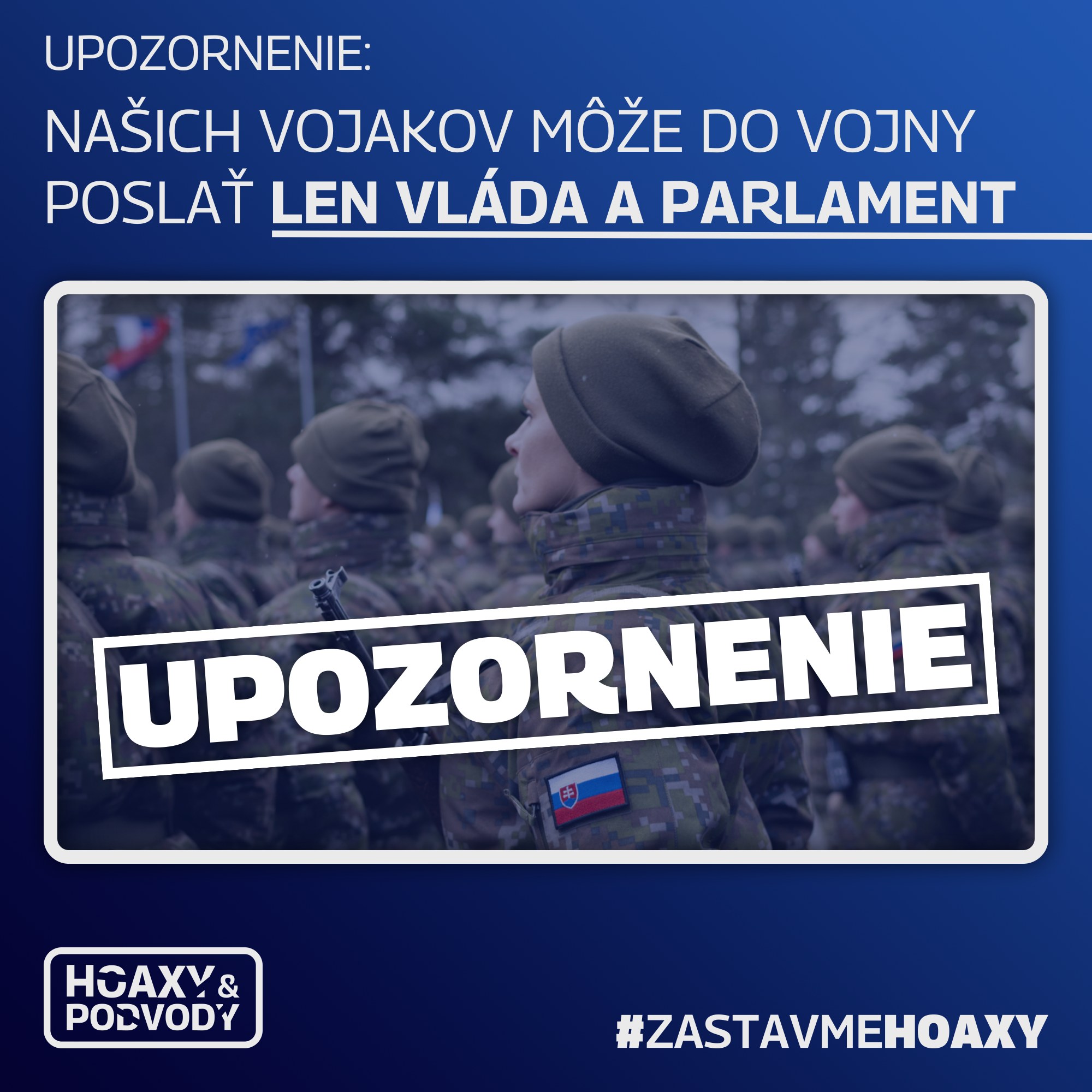 Vraciame sa k hoaxu o nasadení slovenských vojakov do vojny na Ukrajine. Opýtali sme sa Ministerstva obrany SR, či existuje akýkoľvek dokument, ktorý by zaväzoval nasadiť našich vojakov do akejkoľvek vojny.Odpoveď: „Nie, neexistuje. Akékoľvek nasadenie OS SR do vojny, či konfliktu na území iného štátu,...