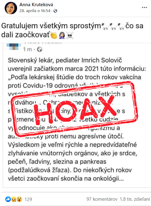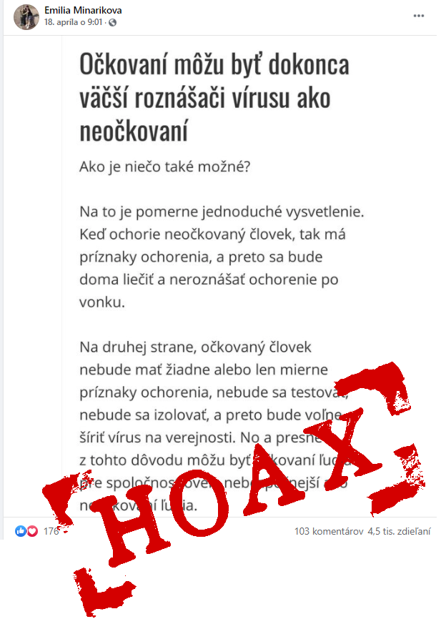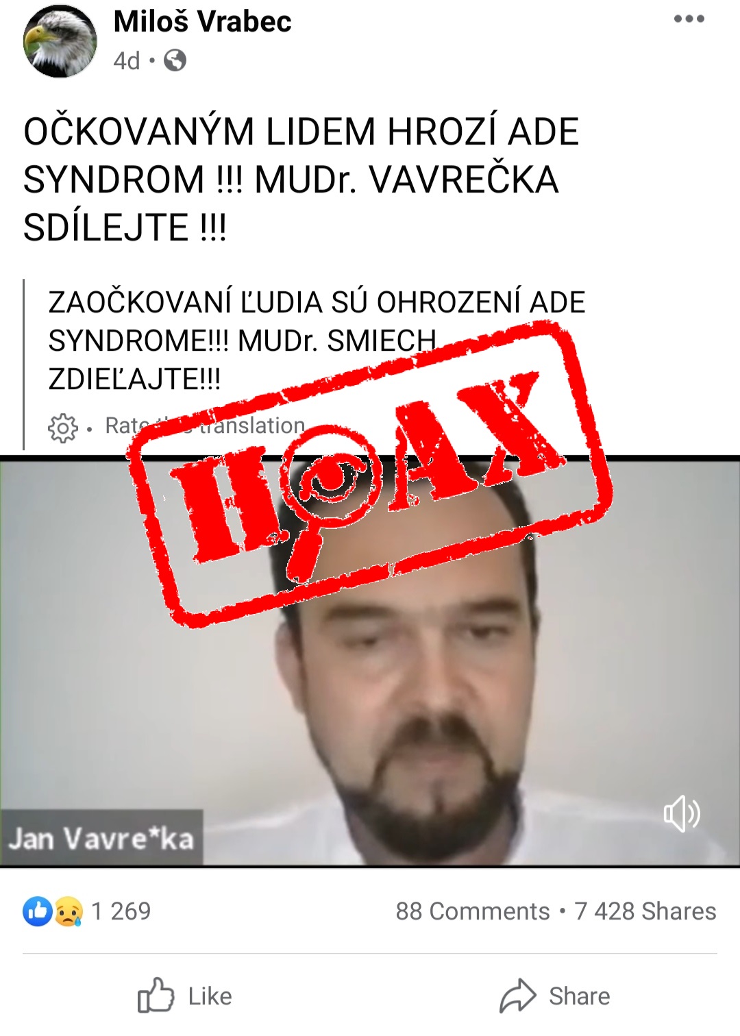 Facebookový profil Miloš Vrabec zdieľal na jednej z verejných skupín video, v ktorom český lekár MUDr. Jan Vavrečka k očkovaniu proti COVID-19 hovorí, že podľa jeho názoru hrozí očkovaným ľuďom tzv. ADE syndróm.Ide o fenomén, pri ktorom nasledujúca replikácia vírusu na suboptimálne protilátky zvyšuje jeho...