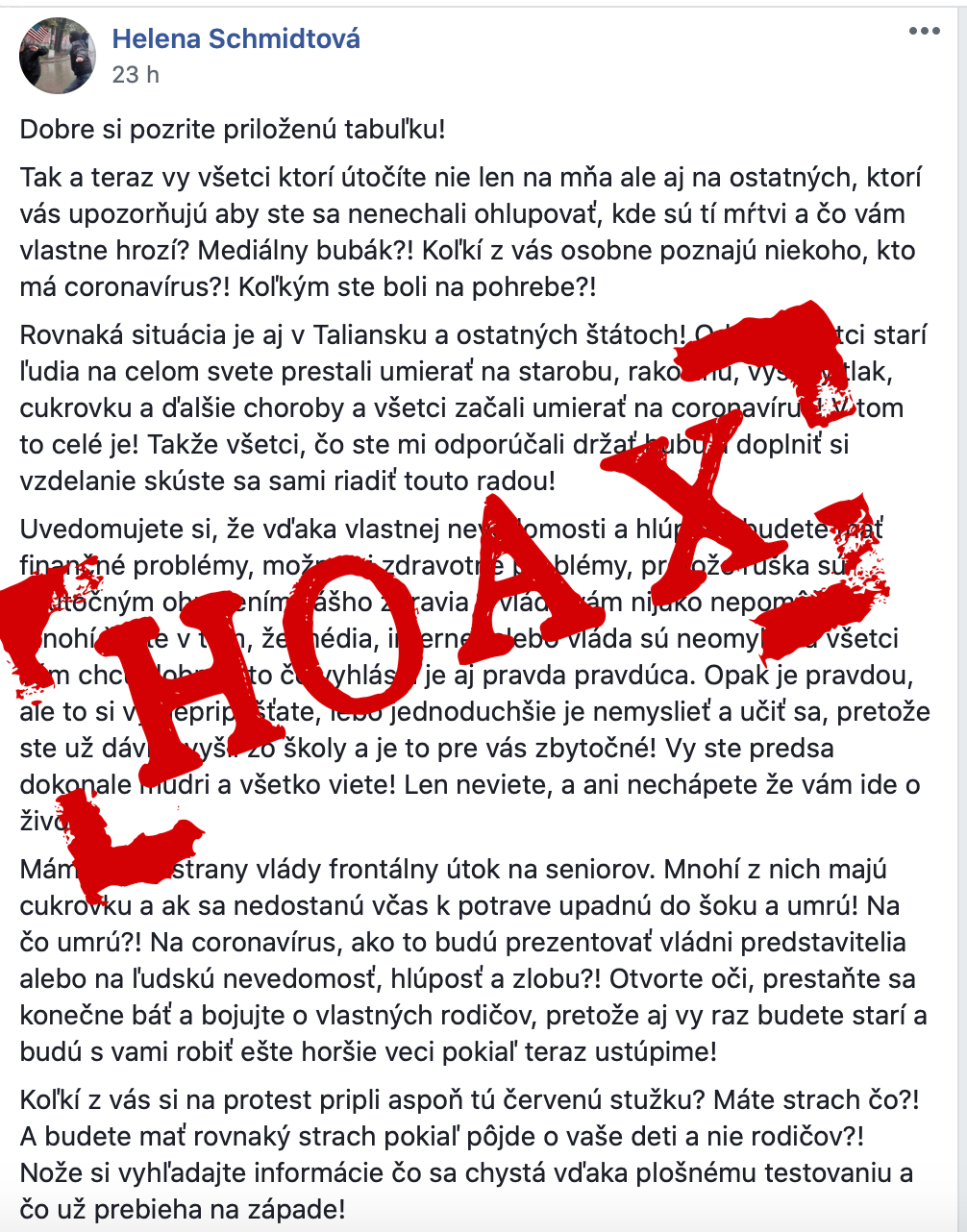 Účet pod názvom "Helena Schmidtová" sa pýta: "Koľkí z vás osobne poznajú niekoho, kto má coronavírus?! Koľkým ste boli na pohrebe?!"Odpoveď: Ak si sama odpovedala, že nepozná osobne nikoho a nebola nikomu na pohrebe, môže za to ďakovať prijatým mimoriadnym opatreniam a disciplíne spoluobčanov. Koronavírus...
